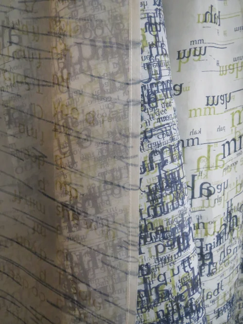 The words of the story become material: heard, recorded, printed, stitched, and traced in order to making the invisible visible. The audio recording is fragmented and layered, just as the memory patterns are embedded and re-collected. Dense and open imprints of text refer to the present and past; the text is readable or illegible. Sixty-four layered ‘pages’ tell the story of a story, from hand-written transcription, to a digital typeset screen-printed image of the text on fabric. Each page contains a fragment of the text; the story is not complete on any one. Traced and embroidered words highlight the shared memories, those that mirror my own early memories of making marks on cloth.