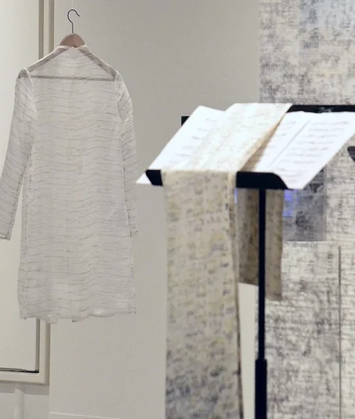 The garments worn by vocalist Elizabeth Windnagel were printed with unintelligible text from Joey's score Jewface. Saxophonist Kyle Hutchins is draped with a printed shawl, which is taken from him at the end of the piece.